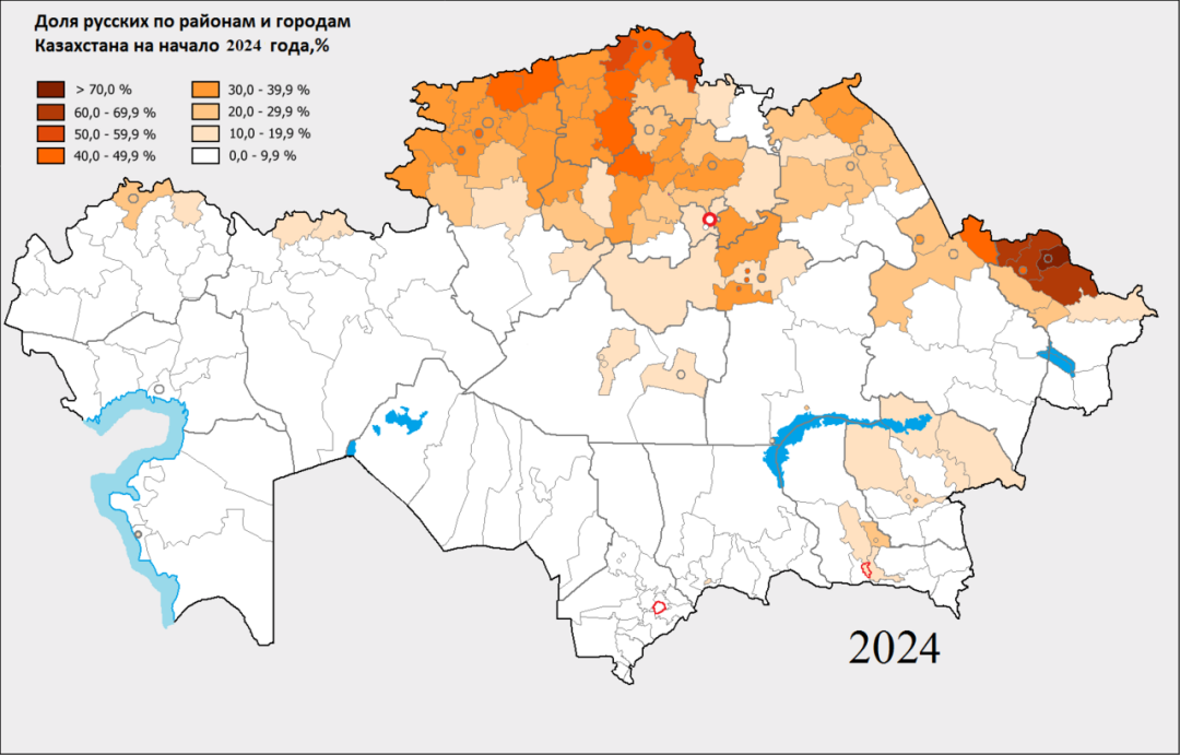 哈萨克斯坦的俄罗斯人分布,集中在北部地区